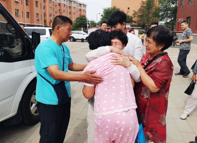 當(dāng)一行人下車后看到,迎接他們的李曉霞親人和包頭社會(huì)救助站的工作人員時(shí)都很激動(dòng),李曉霞與家人團(tuán)聚相擁而泣時(shí),在場(chǎng)的每一個(gè)人都感動(dòng)不已。
