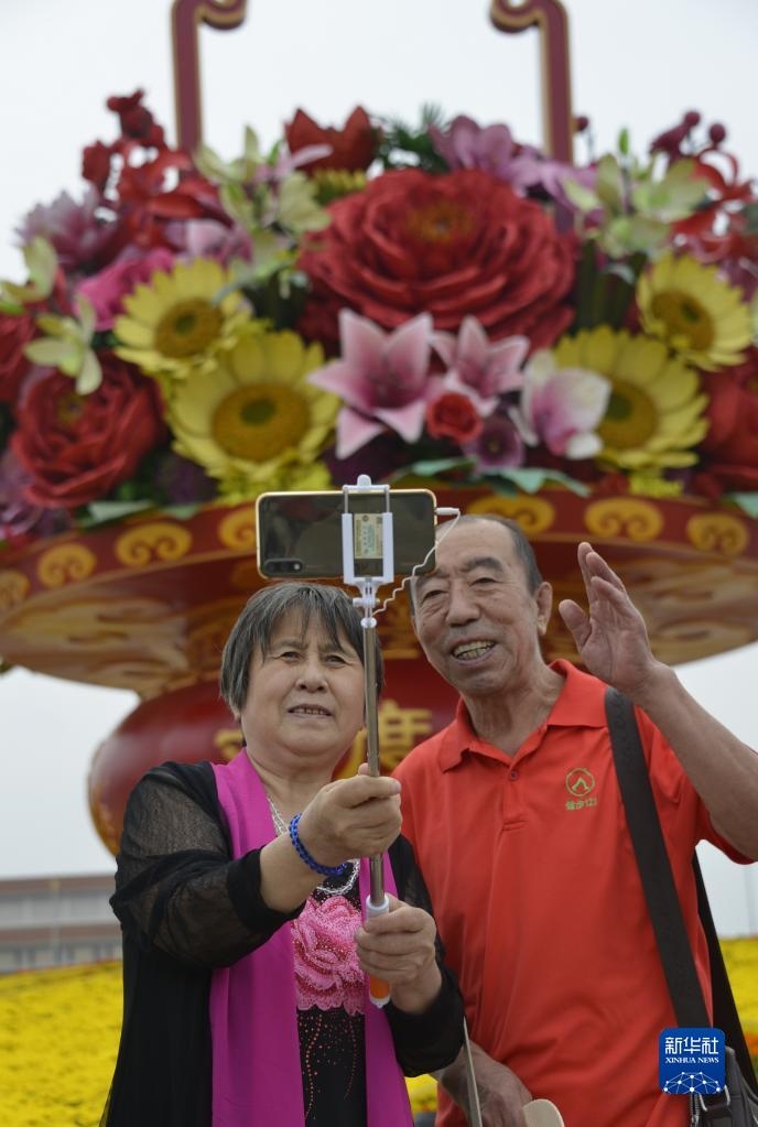 游人在天安門廣場與“祝福祖國”主題花壇合影留念(9月28日攝) 新華社記者 李欣 攝