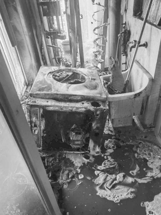 經(jīng)了解,起火點(diǎn)位于業(yè)主家的北陽臺,業(yè)主將吹風(fēng)機(jī)開機(jī)對著陽臺水管吹了整整一夜,該吹風(fēng)機(jī)發(fā)生故障著火后引燃了堆積的雜物,洗衣機(jī)被燒得只剩下骨架,玻璃窗戶受熱后完全破碎,雜物悉數(shù)被燒,水管、墻面也被熏黑。