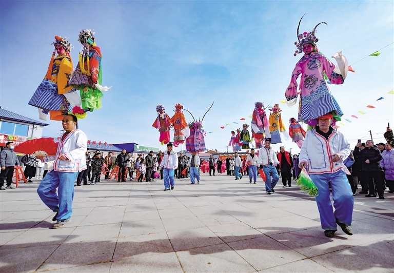 2月14日,在呼和浩特市土左旗畢克齊鎮(zhèn)臘鋪村文化廣場上,秧歌扭起來,鑼鼓敲起來,腦閣也款款擺起來。腦閣是國家級非物質(zhì)文化遺產(chǎn),扛閣的人在行走中踏著鼓點,通過身體搖動帶動架子上的孩子擺起來,極具觀賞性。(記者 鄭學良 通訊員 楊鑫 )