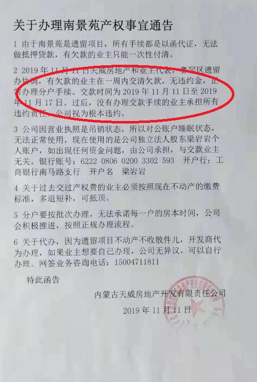 對(duì)于賈麗娟的說(shuō)法,南景苑小區(qū)的居民告訴記者:“2019年11月11日,天威房地產(chǎn)公司曾在小區(qū)張貼過(guò)一則關(guān)于辦理南景苑產(chǎn)權(quán)事宜通告,公告中已經(jīng)明確,2019年11月11日天威房地產(chǎn)和業(yè)主代表、賽罕區(qū)遺留辦協(xié)調(diào),有欠款的業(yè)主在一周內(nèi)交清欠款,無(wú)違約金,正常辦理分戶(hù)手續(xù)。這充分說(shuō)明了我們不需要在交納違約金暨滯納金,賈麗娟所說(shuō)的滯納金明顯與當(dāng)年的通告內(nèi)容相違背。再說(shuō),天威房地產(chǎn)公司營(yíng)業(yè)執(zhí)照處于吊銷(xiāo)狀態(tài),好多地方存在違約行為,按合同約定公司應(yīng)該賠償給居民的錢(qián)誰(shuí)來(lái)負(fù)責(zé)?”(北方新報(bào)正北方網(wǎng)首席記者 高志華 實(shí)習(xí)生 張子椒)