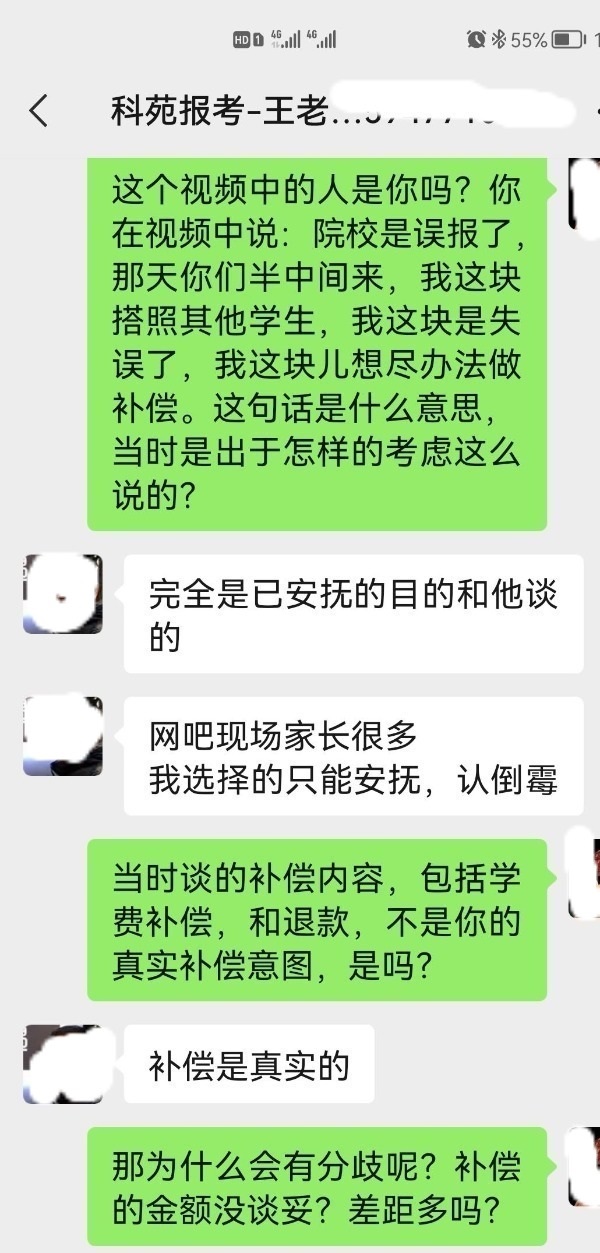 據(jù)樊女士介紹,負(fù)責(zé)給小安報(bào)志愿的是科苑報(bào)考的王金寶老師,也是內(nèi)蒙古科苑信息科技有限公司的股東之一。樊女士提供的視頻顯示,這名老師在網(wǎng)報(bào)志愿現(xiàn)場(chǎng)回復(fù)樊女士:“院校就是誤報(bào)了,因?yàn)槟翘炷銈兪前胫虚g來,還有其他學(xué)生,搭照學(xué)生,我這塊兒就失誤了,我這塊兒想盡辦法做補(bǔ)償。”然而,樊女士反映,那天以后,這名老師開始反口,不承認(rèn)誤報(bào),也不愿意按照當(dāng)天商定的補(bǔ)償方案執(zhí)行。