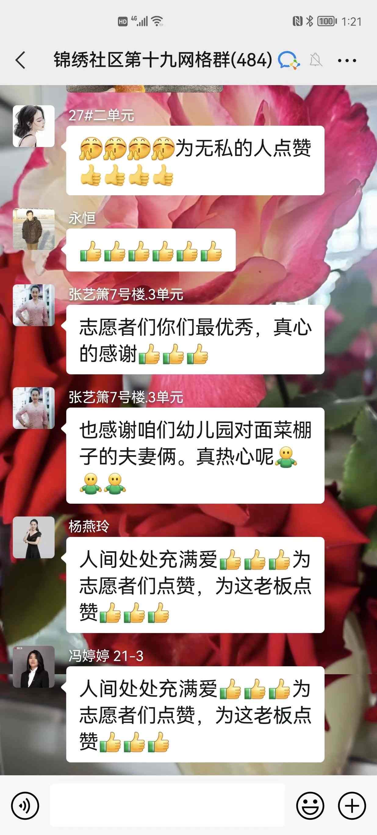 “10元、20元、30元、50元、100元……”10月28日晚,在錦繡社區(qū)第十九網(wǎng)格群,業(yè)主的捐款紛至沓來,短短4個小時籌款近萬元。原來,由于景觀花園小區(qū)物業(yè)原有的消殺工作人員肌肉拉傷,消殺速度遠(yuǎn)遠(yuǎn)達(dá)不到預(yù)期,業(yè)主楊博鵬便在群里發(fā)出組建一支消殺志愿者團隊的倡議,號召業(yè)主們捐款購買專業(yè)消殺彌霧機和藥品。沒想到倡議得到了廣大業(yè)主的一致響應(yīng),“我報名!”“我也報名,躺著也是躺著,不如干點有意義的事!”網(wǎng)格群里沸騰起來,大家紛紛解囊相助,張富、斯琴吐、薛國清、崔占、史永生等15位業(yè)主還踴躍報名參加消殺志愿者團隊。