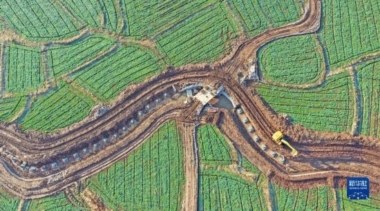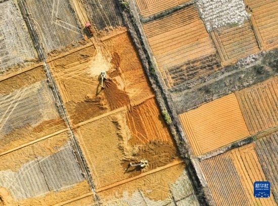 2月16日,在湖南省永州市道縣壽雁鎮(zhèn)芽洞村,工人駕駛挖掘機(jī)在高標(biāo)準(zhǔn)農(nóng)田建設(shè)項(xiàng)目現(xiàn)場(chǎng)施工(無(wú)人機(jī)照片)。