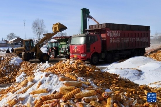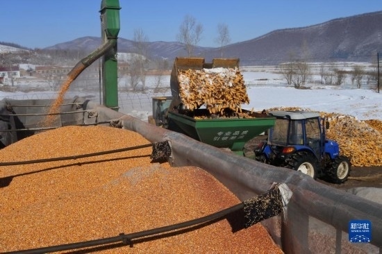 2月15日,在黑龍江省牡丹江市林口縣刁翎鎮(zhèn)三家子村,農(nóng)民利用設(shè)備將玉米脫粒,為春耕做準(zhǔn)備。