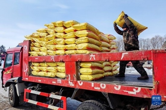 2月16日,北大荒集團(tuán)五大連池農(nóng)場(chǎng)科技服務(wù)中心工人在裝運(yùn)肥料。