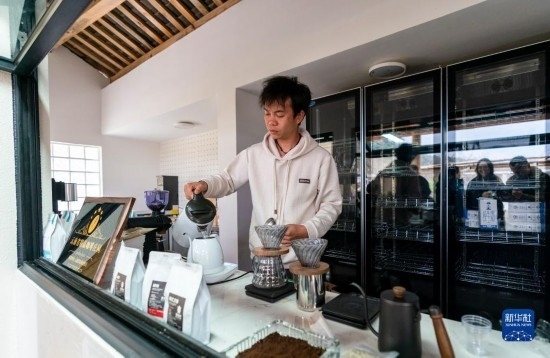 一名咖啡店店主在怒江傈僳族自治州瀘水市魯掌鎮(zhèn)古炭河村為游客沖咖啡(2月21日攝)。
