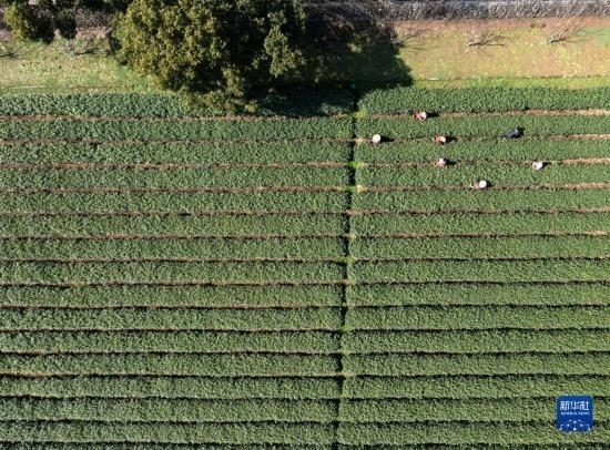 3月13日,梅家塢村的茶農(nóng)在采摘西湖龍井“明前茶”(無人機(jī)照片)。