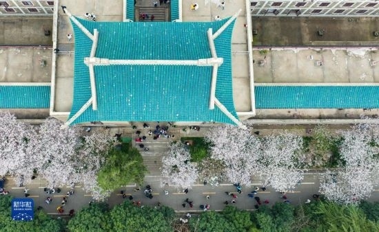 3月18日,來自各地的抗疫醫(yī)護(hù)人員及家屬在武漢大學(xué)校園賞櫻(無人機照片)。