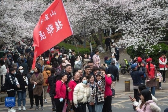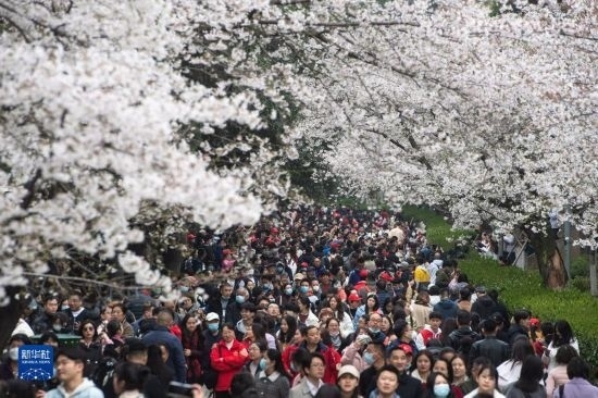 當(dāng)日,武漢大學(xué)舉行抗疫醫(yī)護(hù)賞櫻專場。珞珈山下,來自全國各地的1.6萬余名抗疫醫(yī)護(hù)人員及家屬赴約賞櫻。