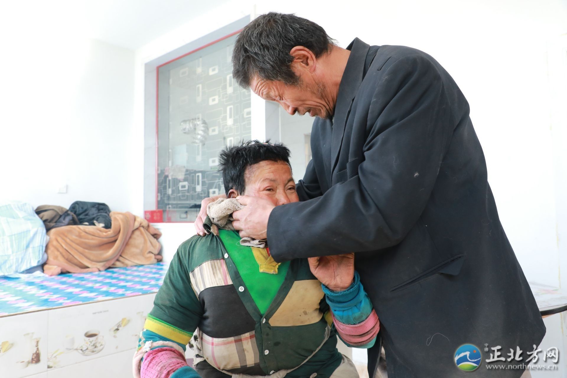在采訪間隙,何蘭鎖的妻子王林愛(ài)回到了家,見(jiàn)到有陌生人顯得很局促。王林愛(ài)患有精神疾病,說(shuō)話顛三倒四。何蘭鎖拿起毛巾,溫柔地為妻子擦拭沾滿灰塵的臉和手,端出早早做好的飯放在桌上:“快吃吧,有你最?lèi)?ài)吃的咸菜?!薄傲謵?ài)其實(shí)命最苦了,啥也懂不得,我要不在了,她一個(gè)人可咋辦呀。我現(xiàn)在最大的心愿是希望能讓她去接受治療?!焙翁m鎖止不住地哽咽道。