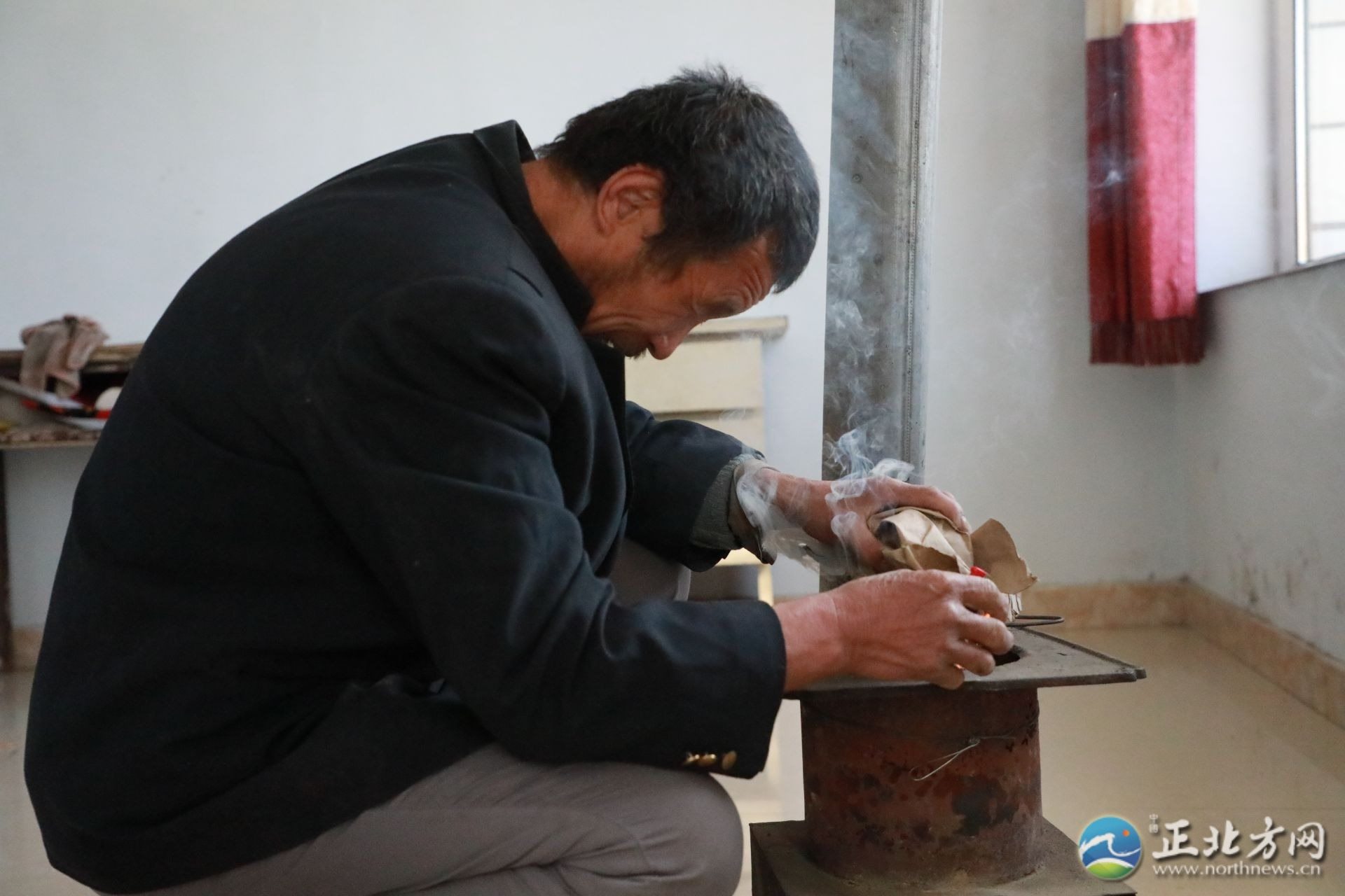 何蘭鎖63歲,黝黑的臉膛,兩個(gè)眼窩深陷,看不到眼珠。聽(tīng)到記者來(lái)采訪,他熱情地把記者讓進(jìn)屋,摸索著拿起水壺倒了兩杯熱茶,“你們稍坐一坐,家里有點(diǎn)冷?!焙翁m鎖笑起來(lái)眉眼彎彎,說(shuō)著,又轉(zhuǎn)身拿著錘子,熟門(mén)熟路地進(jìn)入涼房去打炭,開(kāi)始生火。