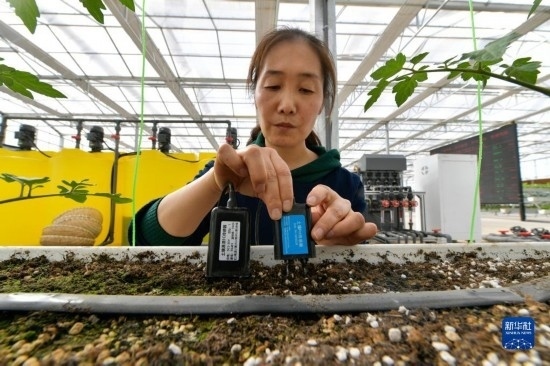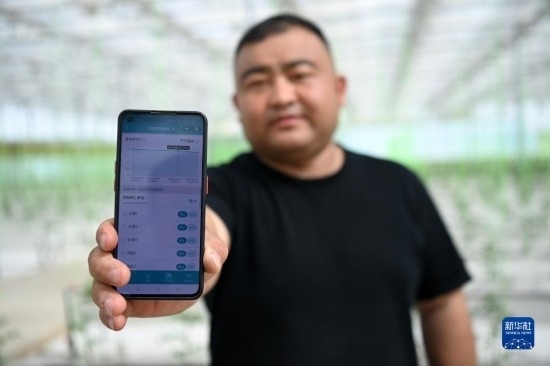 在張掖市甘州區(qū)黨寨鎮(zhèn)陳寨村玻璃智能溫室內(nèi),工作人員展示手機上的智能溫室操控系統(tǒng)(4月10日攝)。