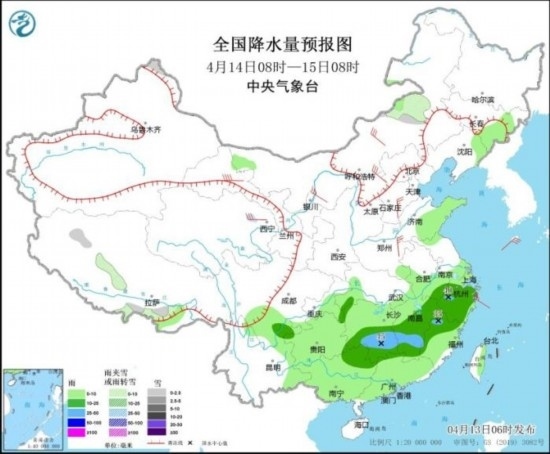 4月13日08時至14日08時,內(nèi)蒙古東北部和中部、黑龍江西北部、新疆南疆盆地南部、西藏南部、青海大部、甘肅中南部和河西等地部分地區(qū)有小到中雪或雨夾雪,其中,青海東部、甘肅河西等地局地有大到暴雪(10~15毫米)。四川盆地西南部、西南地區(qū)東南部、江淮西部、江漢東部、江南北部等地部分地區(qū)有中到大雨,其中,湖南中西部和北部、江西北部等地部分地區(qū)有暴雨(50~80毫米)。內(nèi)蒙古中西部、吉林西部、遼寧大部、西北地區(qū)中東部、華北大部、山東半島等地部分地區(qū)有4~6級風(fēng),其中,西藏北部部分地區(qū)有7~8級風(fēng)。