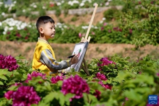 4月16日,小朋友在白臺峪村牡丹農(nóng)業(yè)產(chǎn)業(yè)園內(nèi)寫生。
