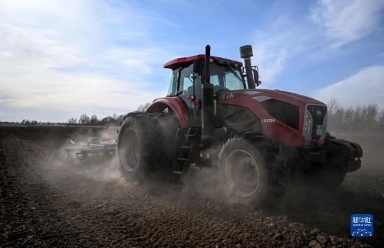 4月12日,在通遼市科爾沁左翼中旗腰林毛都鎮(zhèn),農(nóng)機(jī)在田間整地。