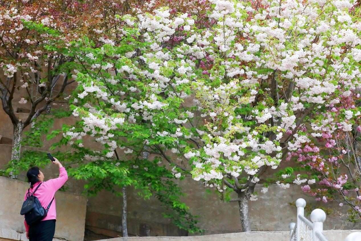 櫻花園里,各類櫻花搖曳生姿,爭(zhēng)相怒放,景色宜人,構(gòu)成一幅幅明麗的春日畫(huà)圖。前來(lái)觀賞的游客紛紛在櫻花樹(shù)下拍照打卡。