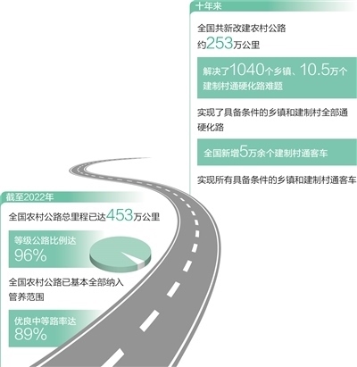 一條條“四好農(nóng)村路”修到村頭,通到了鄉(xiāng)親們的家門口。截至2022年,全國(guó)農(nóng)村公路總里程已達(dá)453萬公里,等級(jí)公路比例達(dá)96%。十年來,我國(guó)支持貧困地區(qū)新改建了6.5萬公里資源路、旅游路、產(chǎn)業(yè)路。