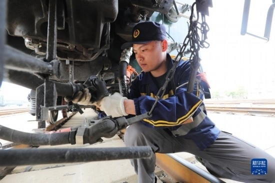 4月28日,中國鐵路上海局集團有限公司徐州站的鐵路連結員在核對現(xiàn)車編組。
