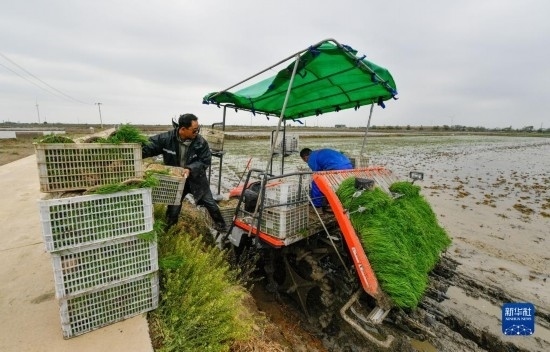 5月5日,在天津市優(yōu)質(zhì)農(nóng)產(chǎn)品開(kāi)發(fā)示范中心,農(nóng)民將秧苗搬運(yùn)上插秧機(jī)。