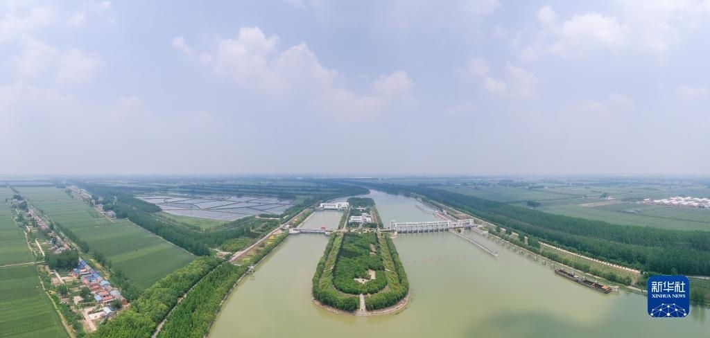 這是位于江蘇省泗洪縣的南水北調(diào)東線一期工程泗洪站樞紐(無(wú)人機(jī)全景照片,5月12日攝)。新華社發(fā)(方東旭攝)