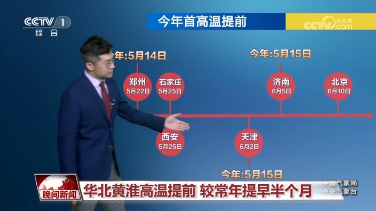 這輪高溫天氣過程,要比常年同期相對(duì)偏早。城市當(dāng)中,鄭州在5月14日,以及天津和濟(jì)南在5月15日都已經(jīng)出現(xiàn)了首個(gè)高溫日,而5月16日,石家莊和北京也有可能會(huì)出現(xiàn)高溫,要比常年同期偏早半個(gè)月左右。