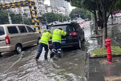 2023年5月22日,廣西桂林,受暴雨影響,城市道路積水嚴(yán)重,交警在積水中合力手推一輛拋錨的汽車(chē)。廣西桂林交警 圖