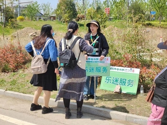在音樂節(jié)會(huì)場(chǎng)外,一名手持“樂迷服務(wù)“導(dǎo)引牌的志愿者耐心為兩名樂迷指引入場(chǎng)方向。趙峰睿/攝