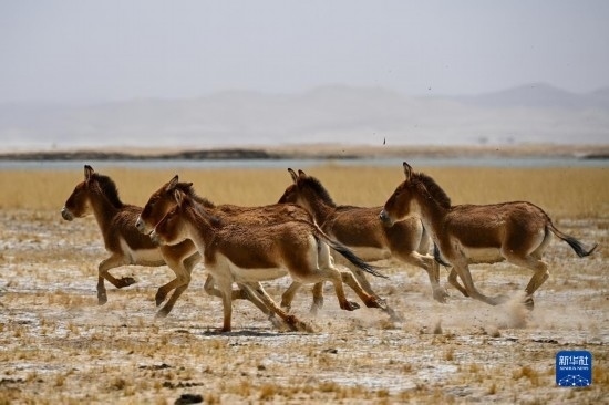 一群藏野驢在阿爾金山國家級自然保護區(qū)奔跑(5月23日攝)。