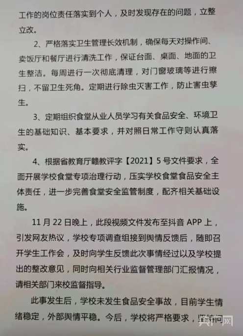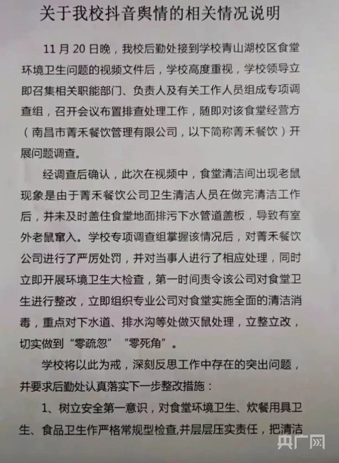 2021年,南昌市場(chǎng)監(jiān)督管理局就曝光該校有老鼠問(wèn)題的情況說(shuō)明(視頻截圖)