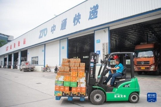 6月8日,在秭歸縣華維電商物流園區(qū)內(nèi),工作人員運(yùn)輸即將發(fā)貨的臍橙。