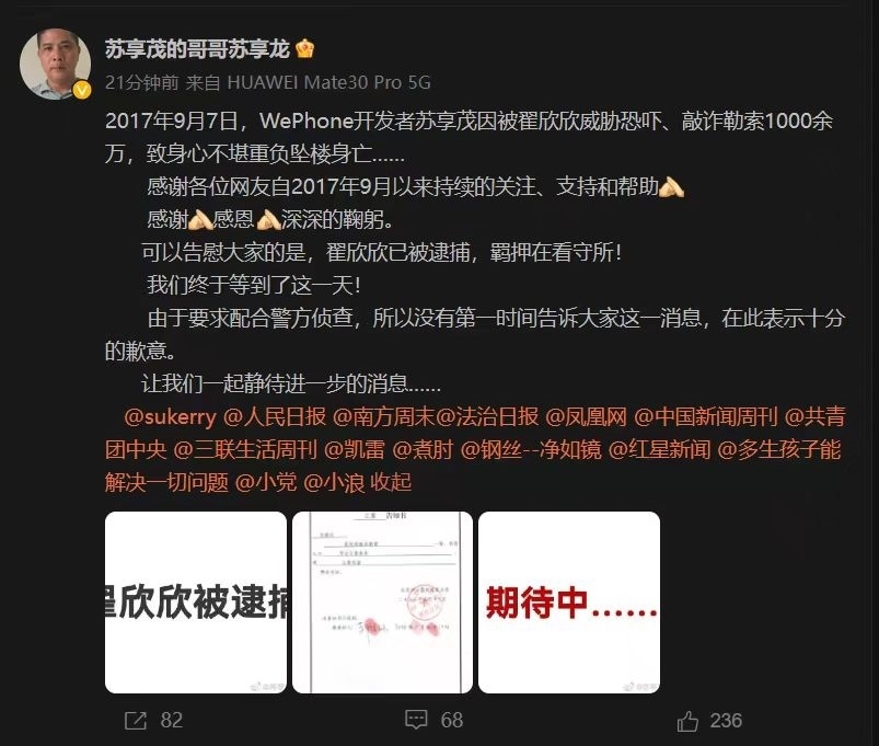 蘇享茂哥哥:翟欣欣涉嫌敲詐勒索已被逮捕