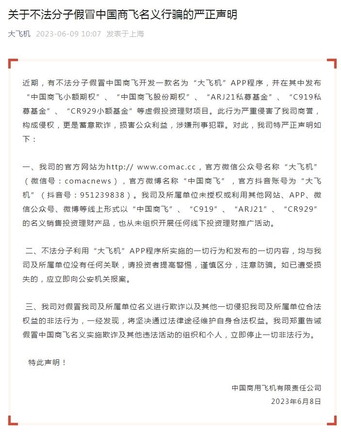 另據(jù)“大飛機”微信公眾號6月9日發(fā)布的《關于不法分子假冒中國商飛名義行騙的嚴正聲明》,有不法分子假冒中國商飛開發(fā)一款名為“大飛機”APP程序,并在其中發(fā)布“中國商飛小額期權”、“中國商飛股份期權”、“ARJ21私募基金”、“C919私募基金”、“CR929小額基金”等虛假投資理財項目。