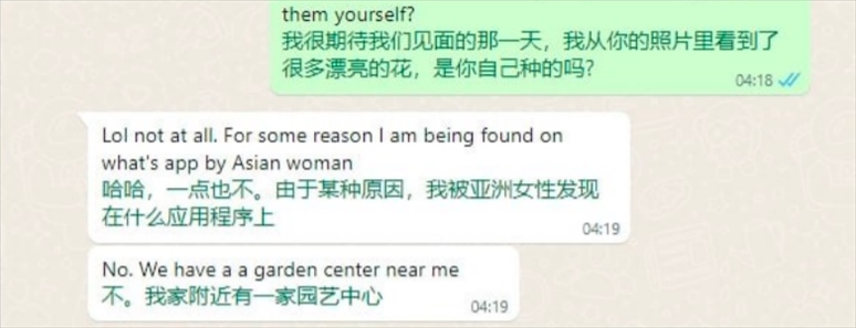 例如,在“聊天范例”中,詐騙人員偽裝的女性詢問對方:“我從你的照片里看到了很多漂亮的花,是你自己種的嗎?”張先生說,其目的就是想判斷對方的居住環(huán)境。
