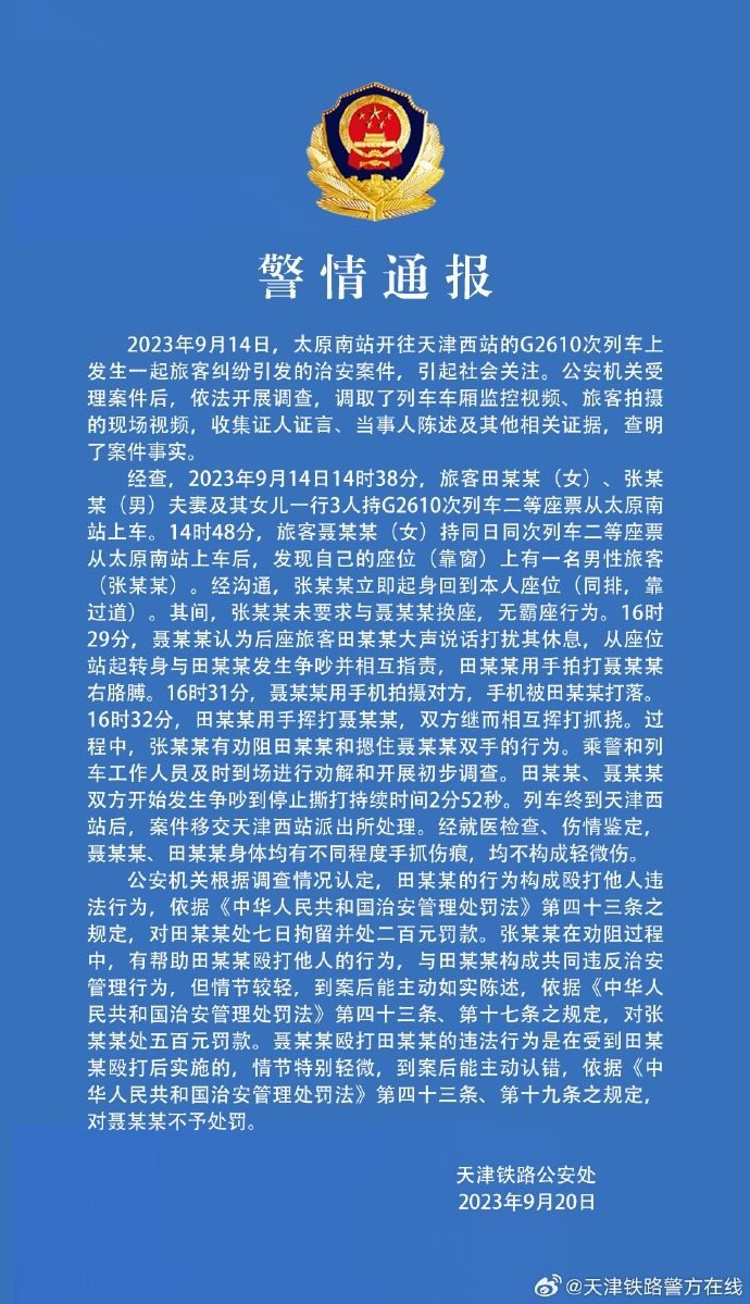 ·天津鐵路公安處就“女子坐高鐵被打”再次發(fā)布警情通報(bào):未要求換座,無霸座行為。