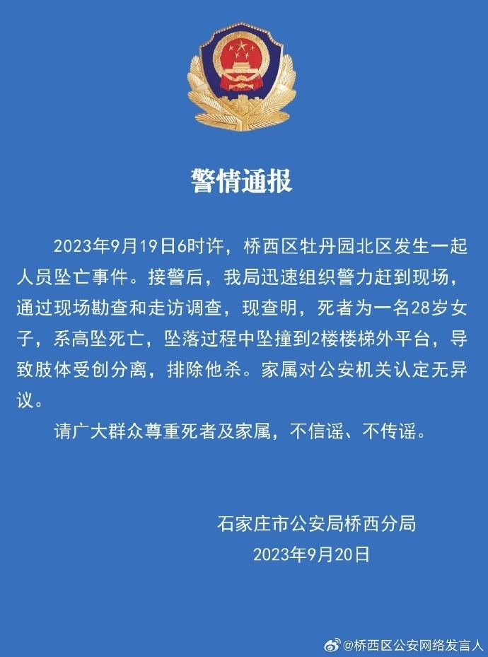 ·石家莊橋西區(qū)發(fā)生人員墜亡事件,警方:系高墜死亡,排除他殺。
