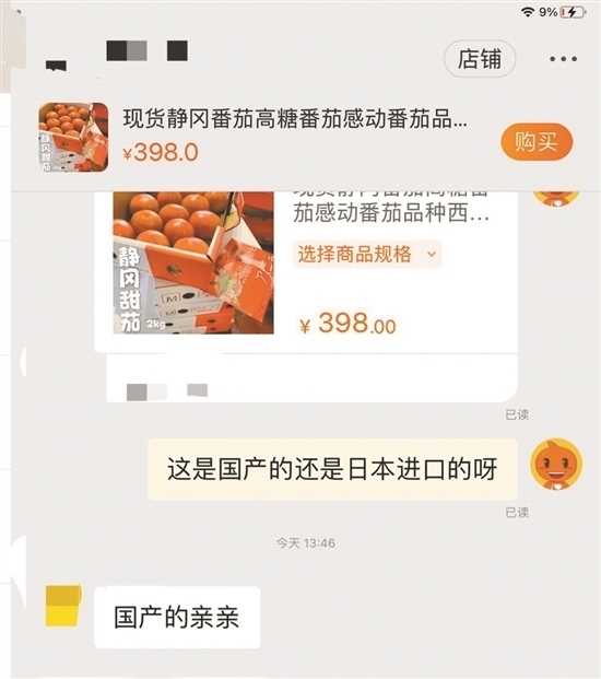隨后,記者隨機(jī)在電商平臺選擇三款標(biāo)明是“進(jìn)口水果”的產(chǎn)品進(jìn)行詢問,結(jié)果對方均表示自己的水果是“國產(chǎn)的”。當(dāng)記者詢問一電商客服,標(biāo)價398元兩斤的“現(xiàn)貨靜岡番茄”和標(biāo)價178元一斤的日本淡雪白草莓是哪里產(chǎn)的時,對方回答“親親,國產(chǎn)的”。