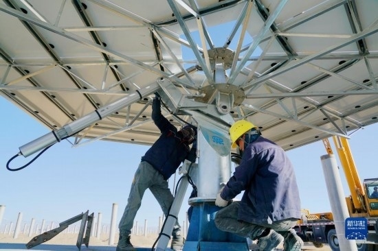 7月21日,在阿克塞千萬(wàn)千瓦級(jí)可再生能源多能互補(bǔ)基地,工人在匯東新能源75萬(wàn)千瓦光熱+項(xiàng)目建設(shè)現(xiàn)場(chǎng)安裝定日鏡。新華社發(fā)(馬曉偉 攝)