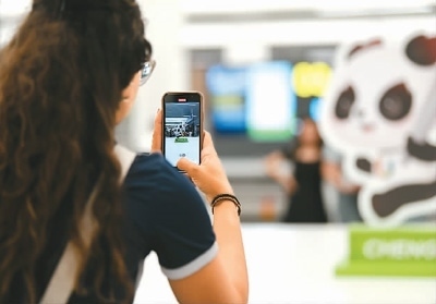 成都天府國際機(jī)場內(nèi),抵蓉的巴西代表團(tuán)成員在等候行李時(shí)拍攝機(jī)場內(nèi)的大運(yùn)會吉祥物“蓉寶”裝飾。新華社記者 胥冰潔攝