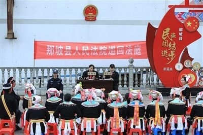 隆林各族自治縣人民法院以全國模范法官黃登林為榜樣,設(shè)立“登林巡回法庭”,創(chuàng)新運(yùn)用黃登林“五大調(diào)解法”,開展壯漢、苗漢、彝漢等雙語巡回審判,滿足少數(shù)民族聚居地群眾的多元司法需求。同時(shí),在德峨人民法庭打造“登林巡回法庭·崢嶸廳”和“民族團(tuán)結(jié)同心苑”等文化場館,開展雙語普法,奏響“最炫民族風(fēng)”司法文化品牌的新樂章。