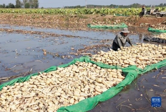 10月5日,河北省新河縣西流鄉(xiāng)西董村一家蓮藕種植合作社的社員在收獲蓮藕。
