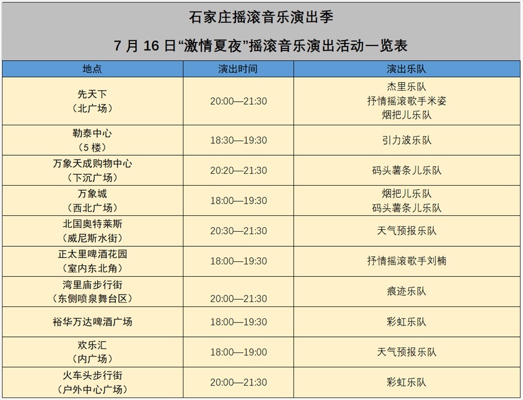 當(dāng)?shù)孛襟w早前報(bào)道稱,9月16日至24日,由河北省商務(wù)廳、石家莊市人民政府聯(lián)合主辦的河北·澳門美食音樂消費(fèi)節(jié)暨河北金秋消費(fèi)季活動(dòng)在石家莊舉辦?;顒?dòng)共包含特色美食節(jié)、音樂休閑節(jié)、激情購(gòu)物節(jié)三個(gè)板塊。其中,音樂休閑節(jié)于每天18時(shí)30分至22時(shí)30分在石家莊正太廣場(chǎng)舉辦。十余位歌手、6支樂隊(duì)帶來精彩的音樂演出,豐富市民游客文化體驗(yàn),演出曲目風(fēng)格包含搖滾、民謠、爵士、抒情等。