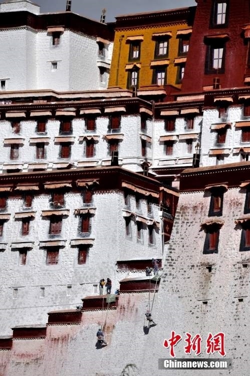 10月19日,西藏拉薩,工作人員對布達拉宮外墻噴灑涂料。每年秋冬交替時節(jié),布達拉宮外墻都要進行粉刷“美顏”。按照慣例,每季粉刷將在藏歷9月22日“神降節(jié)”前完成。