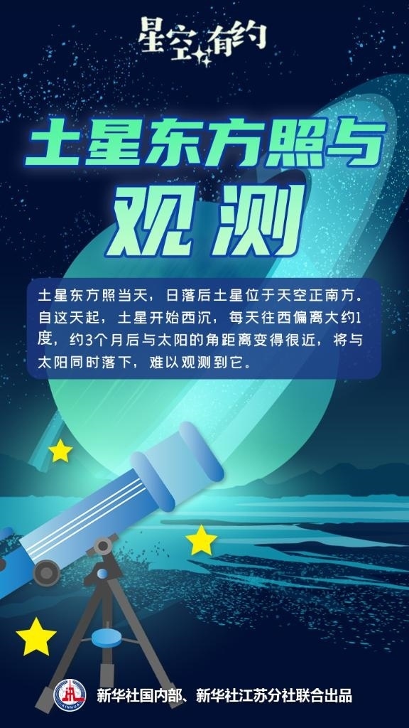 新華社南京11月21日電(記者王玨玢、邱冰清)11月23日17時(shí)47分迎來土星東方照,屆時(shí)土星將位于天空正南方。土星東方照后的一段時(shí)間,土星觀賞條件會(huì)逐漸變差,直至完全不可見。到下一次沖日前后,又迎來下一個(gè)土星觀賞的最佳時(shí)機(jī)。什么是土星東方照?它和土星沖日時(shí)看到的土星有什么區(qū)別?天文科普專家為您揭秘。