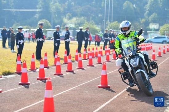 12月1日,在長(zhǎng)沙市望城區(qū)新河學(xué)校,長(zhǎng)沙市公安局望城分局交警大隊(duì)的鐵騎隊(duì)員進(jìn)行技能展示。