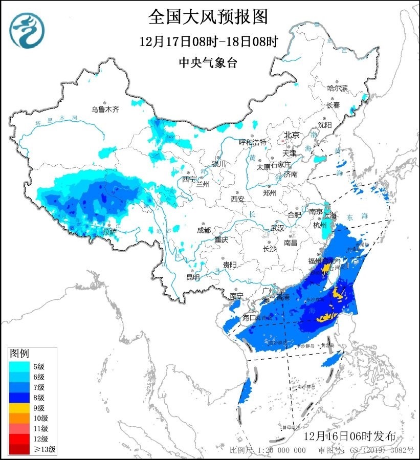 預(yù)計,12月16日08時至17日08時,內(nèi)蒙古中東部、西藏中西部、甘肅河西、河北北部、山東半島東部、江蘇南部、上海、浙江大部等地有5~6級、陣風(fēng)7~8級的大風(fēng),其中,西藏西北部的部分地區(qū)有7~8級、陣風(fēng)9~10級的大風(fēng);渤海、渤海海峽、黃海大部海域、東海大部海域、臺灣海峽、臺灣以東洋面、巴士海峽、南海北部和中部海域、北部灣將有7~8級、陣風(fēng)9~10級的大風(fēng),其中臺灣海峽、巴士海峽和南海東北部的部分海域風(fēng)力可達9級、陣風(fēng)10~11級。