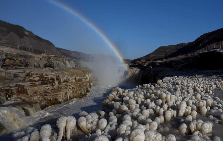 黃河壺口瀑布呈現(xiàn)彩虹冰掛美景。