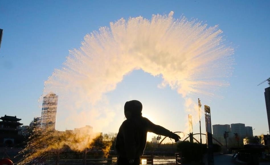 12月16日清晨,山東濰坊室外氣溫零下11攝氏度,市民在戶外體驗“潑水成冰”。