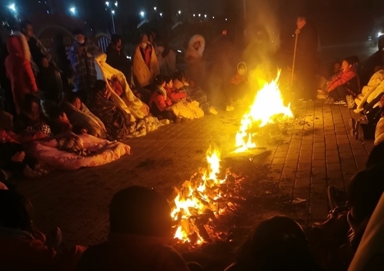 12月19日凌晨,積石山縣高關(guān)初級(jí)中學(xué)的學(xué)生圍坐烤火。受訪者供圖
