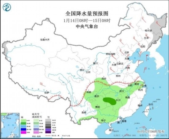 全國降水量預(yù)報圖(1月12日08時-13日08時)
